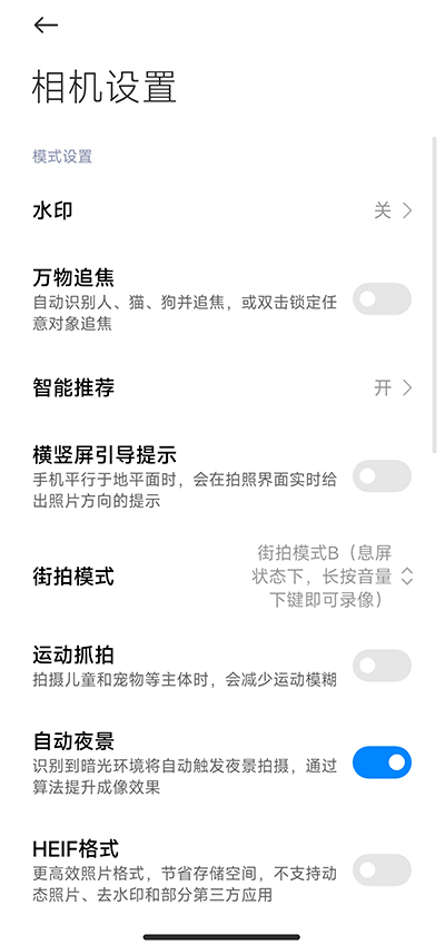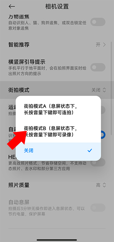5、找到街拍模式选项并选择街拍模式B,即可在息屏状态下长按音量键-来录制视频了