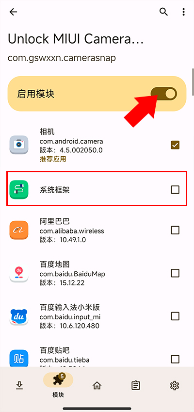 2、打开我们的LSP/XP框架管理器,并激活模块(如模块激活后失效,请勾选系统框架,然后重启手机)