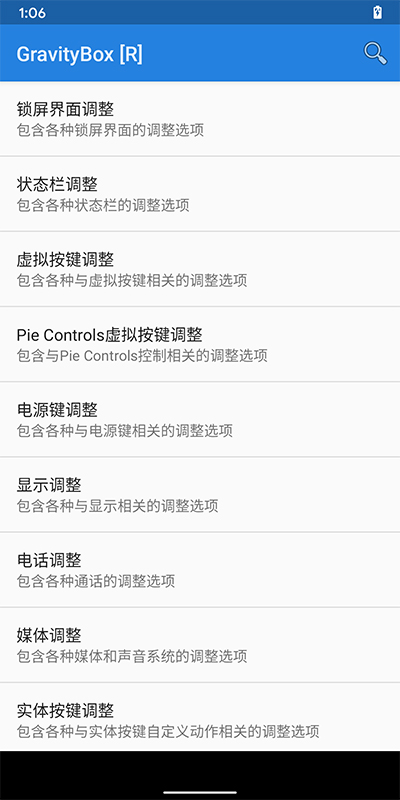 重力工具箱安卓11版(GravityBox [R])是一款专为Android R系统设计的高级界面美化软件,功能非常强大。它允许用户自定义锁屏、状态栏、电源键菜单等,并提供手势和按键的个性化设置。虽然这款工具箱功能丰富,但只适用于原生或类原生安卓11系统,像MIUI这样的定制系统可能会出现兼容性问题。