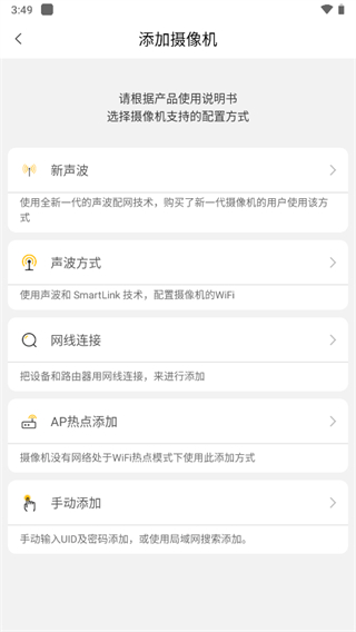4、小编这里以网络摄像机为例,点进去后我们可以选择手动添加、网线连接、声波方式进行连接。