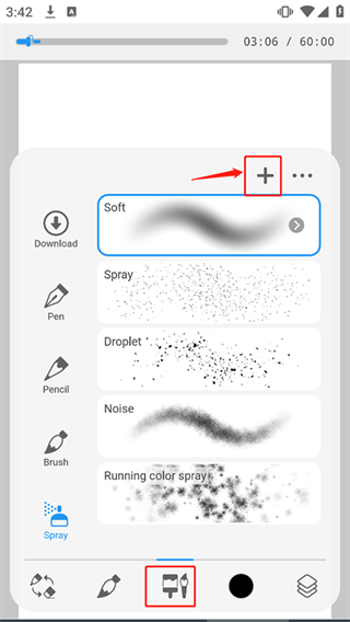 3、进入画板界面后,点击中间画笔图标,然后在点击右上角+号按钮