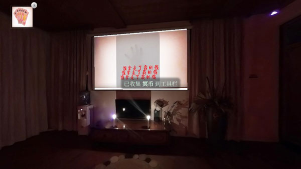 1、点击茶几上的【遥控器】,打开投影仪。