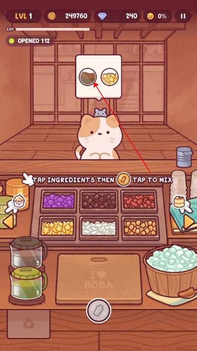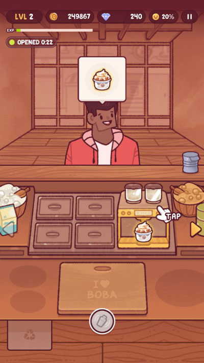 bobatale游戏的界面非常简洁,中间主要用来制作奶茶,鲷鱼烧和松饼需要点击右边箭头再烘焙,冰淇淋则在左边,在等待客人的间隙可以先去将蛋糕和甜品烘焙好,以便能在第一时间响应客户订单,在有限时间里赚取更多的金币,等到操作熟练以后,就可以使用金币增加客流量啦,感兴趣的小伙伴赶快来下载游戏体验一下奶茶的制作吧!