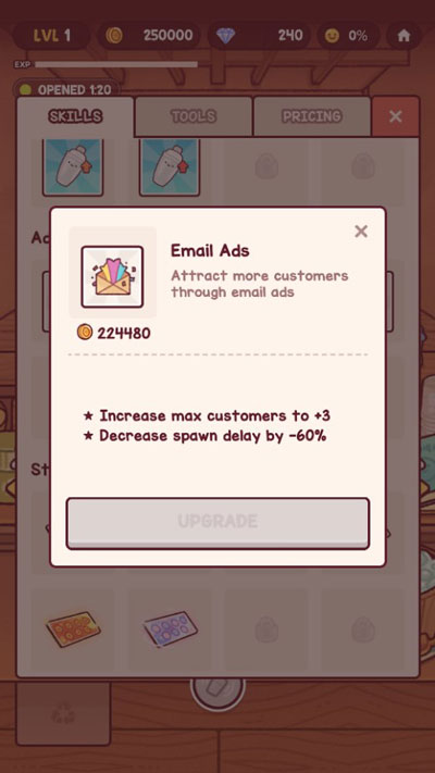 2、收到的金币可以用来升级茶底和雪克杯,以及提升制作技能和购买店内店外的装饰品,让奶茶店更漂亮~