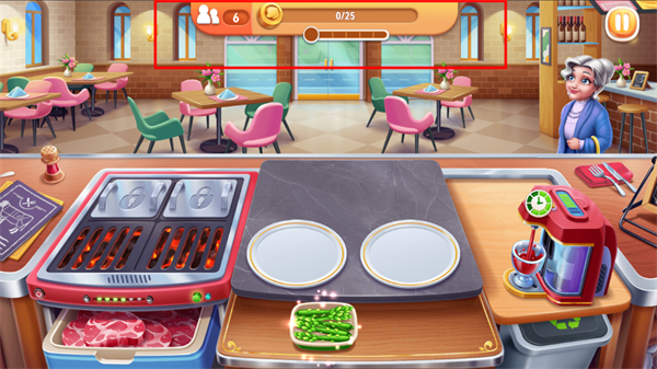 游戏中,通关条件分为三个类型:1、营业一定数量金币;2、获得顾客好评数;3、上足够数量的菜。