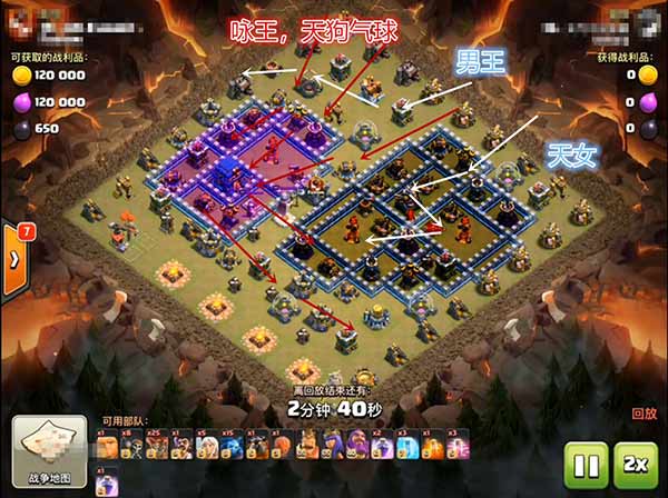 狗球配合永王从12点往大本营方向前进,路上永王技能来躲避大本营爆炸伤害,冰冻法术则给在了地狱塔和防空这里,几秒的时间足够气球飞向这些防御建筑了。