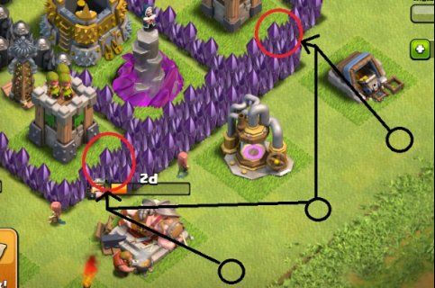 敌人在黑圈处下的炸弹人会跑去红圈处开墙,中间的法师塔有机会秒杀他们。部落城堡是新手的最强防御建筑,部落城堡里涌出的弓箭手,法师,气球,或者龙将会是许多进攻者的噩梦。布阵时切记尽量将部落城堡放置在阵型的中央,不要让敌人能轻易的勾引出你的援兵。对于新手来说从头开始打造一个阵型肯定是非常困难的。你可以通过互联网来搜索一个适合你的框架,然后通过自己的经验来改良,从而创造出一个独一无二的阵型。