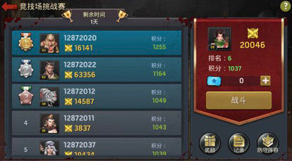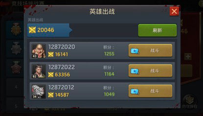 随后点击战斗按钮,会弹出选择对手界面,根据玩家积分显示3个对手供玩家选择(如下图),会显示要挑战玩家的基本信息,和挑战需要的挑战券数量。