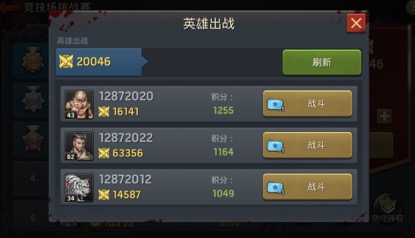 随后点击战斗按钮,会弹出选择对手界面,根据玩家积分显示3个对手供玩家选择(如下图),会显示要挑战玩家的基本信息,和挑战需要的挑战券数量。