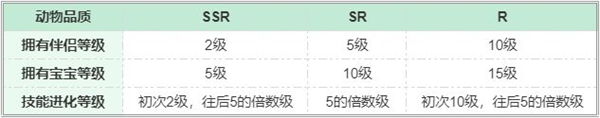 不同的品质的动物达到一定等级时,会拥有伴侣和宝宝并且进化技能,升级需要的动物碎片可以在动物班车、活动-幸运翻盘、每日签到、主题季、庆典宝箱等获得。