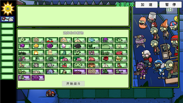 2、玩家可以选择出战的植物,游戏界面右边有出现的僵尸。