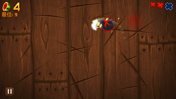 3、水果共有三次因没有切到而失误的机会,而炸弹只要一切到游戏就会马上结束。每积累到100分就会自动补充一次以前失去的机会。