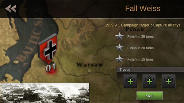 二战名将策略战争破解版是一款真实还原二战战争的即时战略,就等你开始游戏,该款软件采取回合制的游戏方式进行对战,玩家可以选择盟军或者德军,进行对战。游戏中的画面采取了俯视视角来观测整个战局,玩家可以及时的的找到敌人的漏洞一击致命,与此同时游戏还深度还原了各种战争的载具与武器,还有各种兵种的配合情况。玩家要对这些兵种进行有效合理的布置才能获胜,而感兴趣的朋友可以来下载玩玩,绝对的童叟无欺。,这是一款良心之作ps:小编推荐的这款游戏是破解版,内有无限钞票与无限勋章,只要完成新手教程即可获得。
