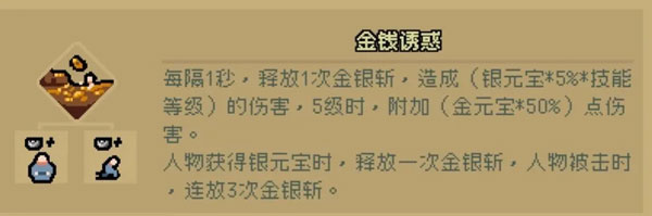 金钱诱惑站着跑着走着都可以赚钱非常方便,而且还能提供伤害,元宝越多越强。