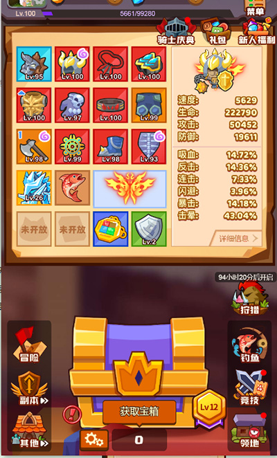 1、疯狂骑士团最核心的部分就是开宝箱获取装备提升战斗力,所以关于宝箱我们只要一有就开,100级的前面主要是为了获取经验升级,不到100级的装备更新换代会非常的快。