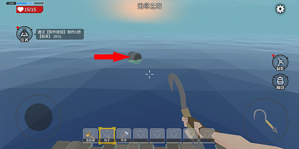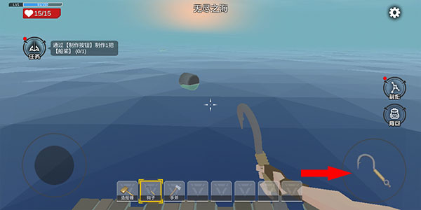 2、初始我们有两个工具,分别是锻造锤与钩子,锻造锤可已用于拓展木筏面积,而钩子可用于勾取远方资源,当资源位于木筏附近时直接点击拾取键即可无需使用钩子