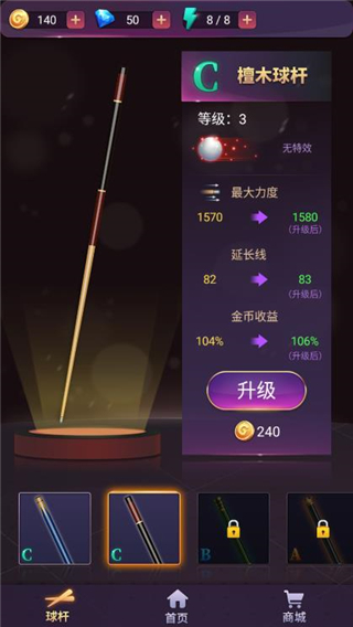 进入球杆界面,玩家不仅可以升级球杆,而且还可以选择自己心仪的球杆