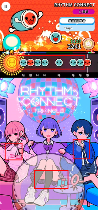 6、大鼓需要两只手同时敲击,红色的大鼓同时敲击鼓面红色框框区域;蓝色大鼓需要同时敲击鼓变得蓝色框框区域即可