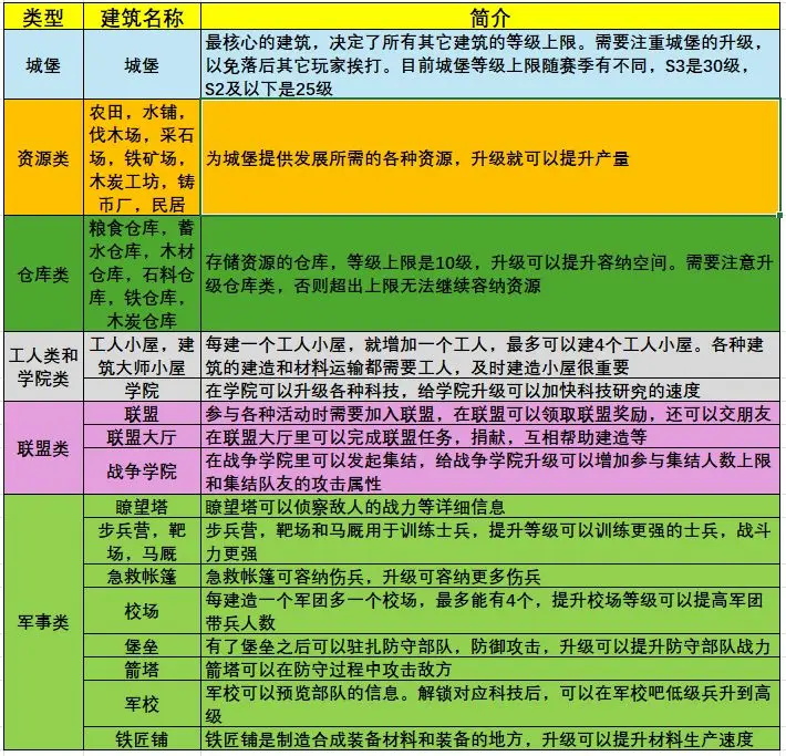 城堡的等级决定了各种建筑解锁和等级上限,以下是各个城堡等级对应的解锁建筑,大家可以根据需要合理安排及时解锁。