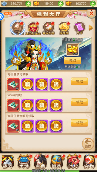 2、登录即送VIP及专属好礼,元宝、化神丹、宝石、千古神兽,来了就有!
