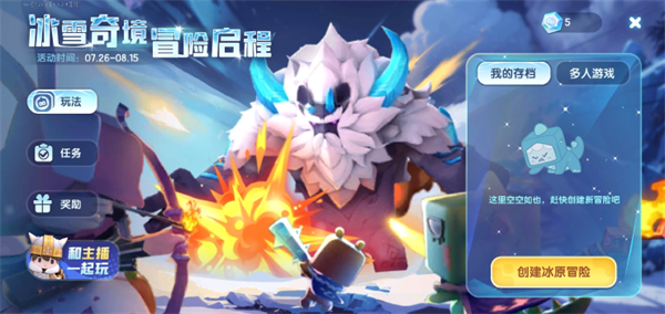 1、进入游戏首先我们会看见右上角有一个冰原冒险,点进去就可以创建冰原冒险了,如果你不想一个人玩,左下角点进去就可以和主播一起玩了。