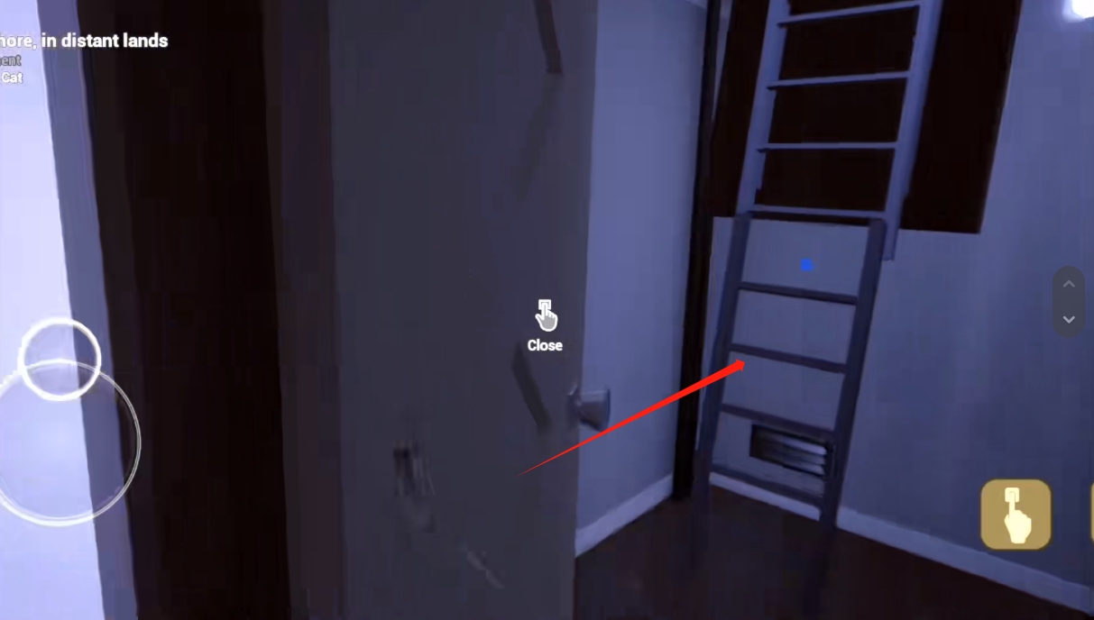 2、进入以后,玩家会出现在房间的外面,有很多房间都是被上了锁的,玩家可以找一下没有被锁住的房间;进入房间后,会发现房间正在晃动,黄衣宝宝也不见了,然后我们先去二楼,从下图这个位置上去;