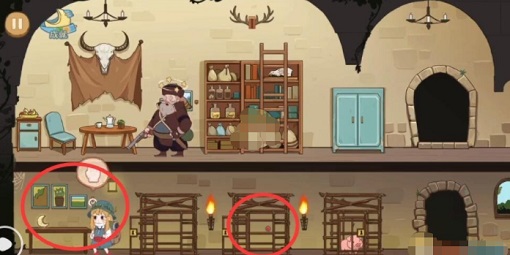 用同样的方法下去,用钥匙开小鸡门,获得鸡蛋;猎人身上有一把钥匙,上到二层用鸡蛋偷袭猎人,掉落银色的钥匙,开启小猫门,这里有一个按钮,按下去,点击获取粉色钥匙和月亮。