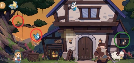 1、先上树去获取毛毛虫,羽毛也掉下来,用毛毛虫喂鸟,鸟飞会打开兔子笼子,猎人就去追兔子了。