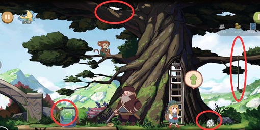 第二关开始猴子会掉下一个道具,这个是道具一,然后和老爷子对话,之后去树下捡起剪刀,然后上梯子去将绳子剪断,会掉下钥匙,同时羽毛也会掉下来,最后用钥匙将玻璃缸打开,获取最后一个道具!
