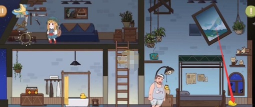拿到帽子之后我们返回在床头上这边有一个闹钟,设置一下,去爬梯子,闹钟响起之后它会被惊醒,然后他床上方的这根杆子就会被打下来,之后继续入睡。
