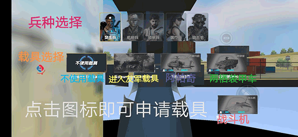 1、载具选择界面进入游戏后,屏幕会出现短暂模糊,然后弹出此界面,即可选择兵种(突击兵、机q兵、侦查兵、医疗兵、狙击手)和载具(阿帕奇、两栖装甲车、战斗机等等),点击图标进入下一步。
