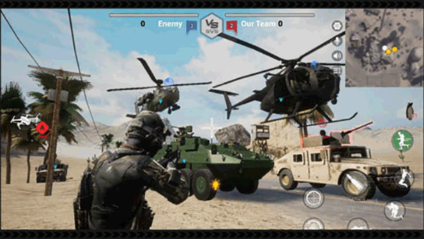 1、海陆空大战,类似战地各兵种,和各类载具,完美配合,直升机上的士兵可以使用自己的单兵武器,向地面的敌人开火。