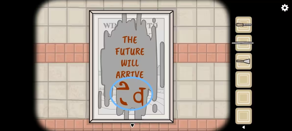 3、到车站左侧将脏尿布放入垃圾桶,用火柴点燃后再用铁杆敲碎桶身获得「刮刀」,接着用刮刀划开墙上的海报获得符号(罗斯胸口怀表的提示)。