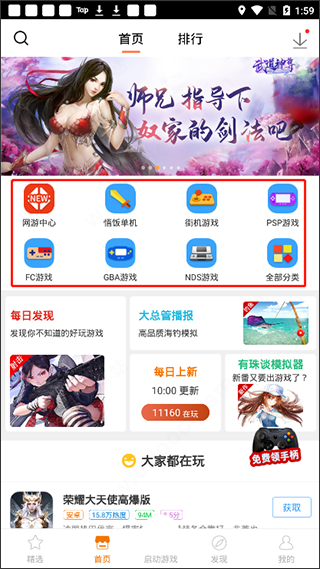 1、在本站下载安装,运行软件,可看到在首页为玩家们提供了各种类型的游戏;