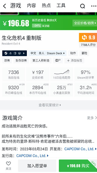 4、游戏库中有Steam里所有游戏的详细介绍,比如最新售价、配置要求、玩家评分、攻略测评等。