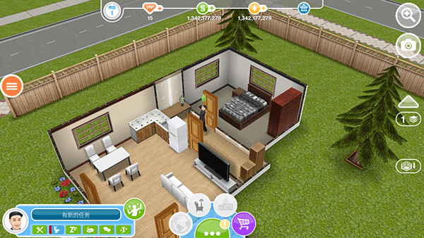 4、游戏内大部分物品物件都是可以互动的,屏幕左下角显示虚拟人物的当前状态,包括饥饿度、上厕所、睡眠、卫生、社交、心情等;中间底部是世界地图以及家具建造商城等,可以在商城购买自己喜欢的家具和定制房屋;右边可以截图,放大等。