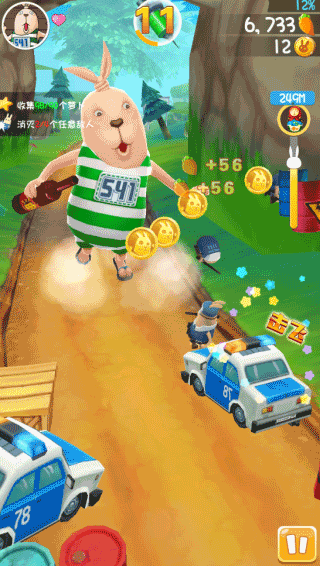 逃亡兔最新版是一款由风靡网络的同名日本卡通短片《越狱兔》改编而来跑酷闯关游戏,游戏完美复刻动画片里面的角色,而且还为它们量身定制了专属的技能和皮肤,就是为了将你代入到动画片里体验被警察追赶的紧张刺激感。同时在你躲避警察的追逐当中还能在路上捡取到非常多的道具,帮助你更加轻松快乐的进行游戏。另外,逃亡兔最新版采用了3D引擎制作而成,卡通幽默的人物形象和熟悉的经典背景音乐能让你放下身心静静享受。而且你还能在游戏当中驾驶卡通汽车,变身成巨人来摆脱警察们的追捕。喜欢逃亡兔的小伙伴可以下载试试看!