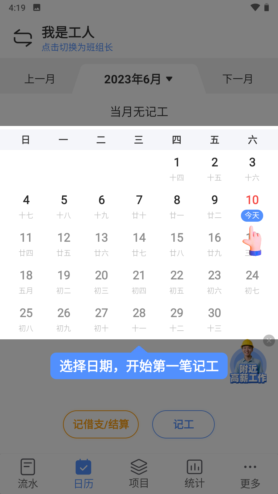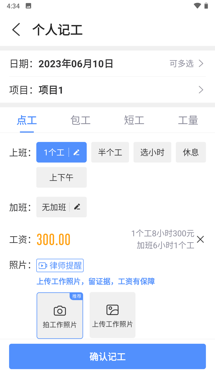 工友可自己选择建立个人记工本、班组记工本,便捷处理建筑工地记工天、记工时、工地记账、建筑工地考勤等工地管理问题,促力为建筑工友提供高效办公服务,体验在线记工天记工时方便。