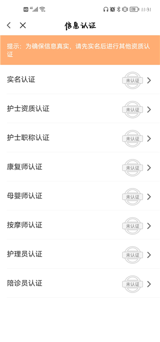 2、不过在接单前你需要在我的页面进行护士资质,护士职称,康复师等认证,认证的资料越多,能接的订单也越多。