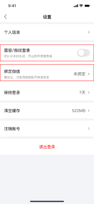 首次登录成功后,可在设置页面开启“面容/指纹登录”或“绑定微信”,开启后在此登录可使用手机自带的面容/指纹登录或微信授权快捷登录。