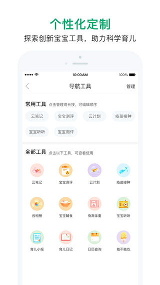 4、进入导航工具页面可以使用各种育儿的实用工具,还能将工具排序。