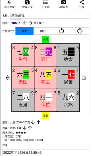 4、摆放罗盘后一键分析八宅布局、九宫飞星、流年,自动辨别天医、生气、延年、伏位、五鬼、六煞、祸害、绝命等方位。点击“VR实景”后自动为真实场景添加方位属性标签。