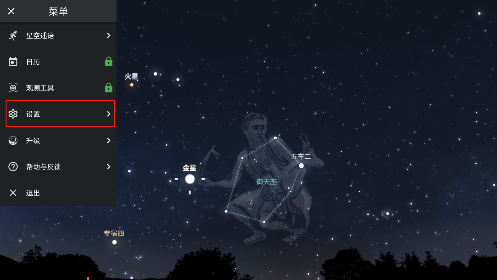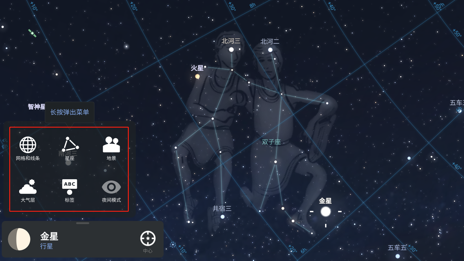 2、就可以显示网格和线条、星座、地景、大气层、标签,还可以设置夜间模式;