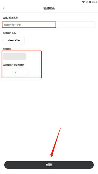 3、输入绘画的名称,选择画布大小、背景、每秒渲染的帧数,然后点击创建;