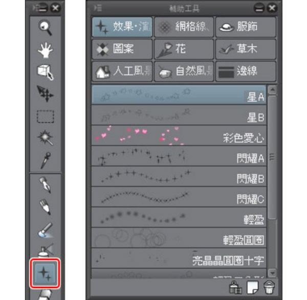 ⑤从[工具]面板中选择[沾水笔]工具,再在[辅助工具]面板上点选[G笔]。