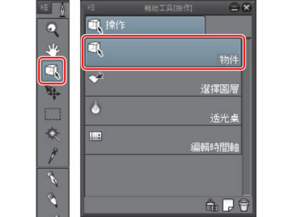 ①从[工具]面板上选择[操作]工具,并在[辅助工具]面板中选择[物件]辅助工具。