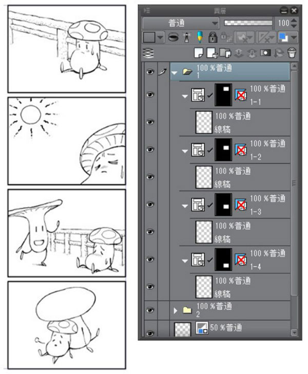 在绘制漫画的过程中,则是在这些图层的上面一边进行作业一边追加图层,像是「分格边框」和「描线」、「黑底・网点」等等。