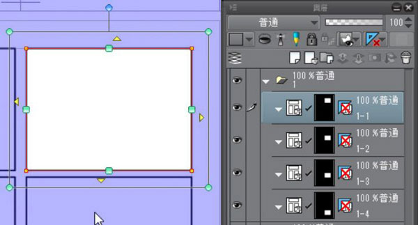 ②点选想要描线的分格内侧,就能将编辑对象变更为选择的分格的[分格边框资料夹]。点选第1格分格,就会选择「1-1」资料夹。