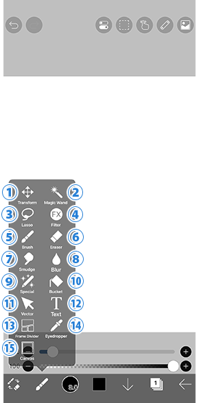 这些工具从上到下依次是:①[ 变换工具 ], ②[ 魔棒工具 ], ③[ 套索工具 ], ④[ 滤镜工具 ]、⑤[ 画笔工具 ]、 ⑥[ 橡皮擦工具 ], ⑦[ 涂抹工具 ]、 ⑧[ 模糊工具 ]、 ⑨[ 特殊钢笔工具 ]、 ⑩[ 油漆桶工具 ],⑪[ 矢量工具 ],⑫[ 文本工具 ],⑬[ 帧分隔器工具 ]、⑭[ 吸管工具 ]、 ⑮[ 画布工具 ]。