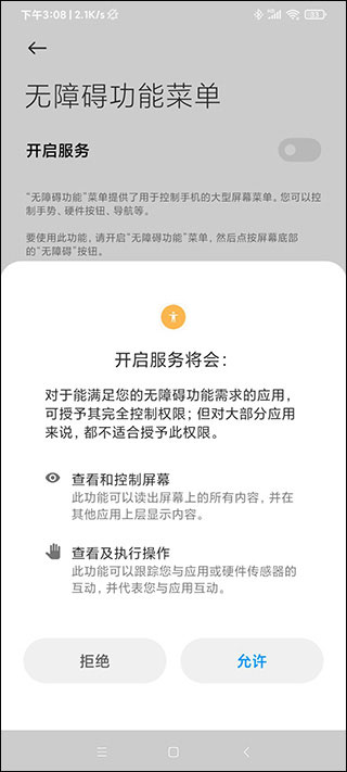 3、点击允许开启无障碍功能菜单。